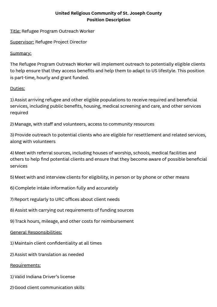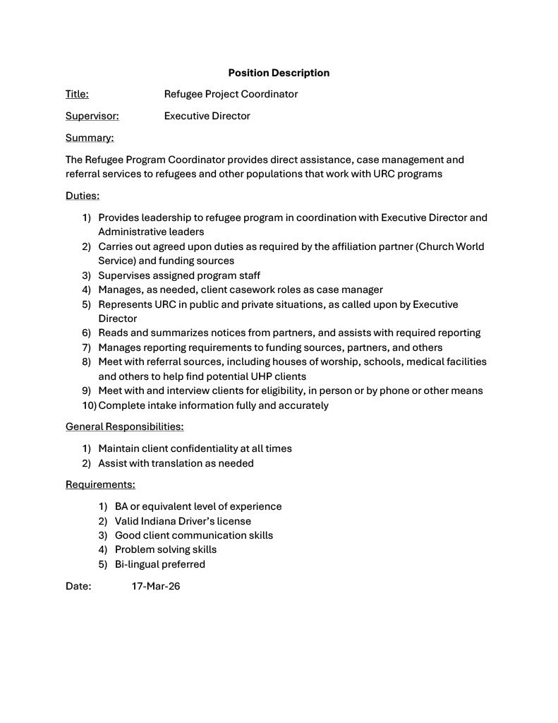 The URC is hiring for two positions currently. The general position descriptions are provided below. The positions are part-time, and subject to grant funding currently provided by the Office of Refugee Resettlement via URC’s affiliate status with Church World Service. The pay range for each is $19-22/hour to start.